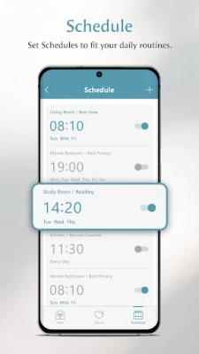 Set Schedules to activate scenes automatically at desired times of day. Easily enable or disable your Schedules to match your daily routine.